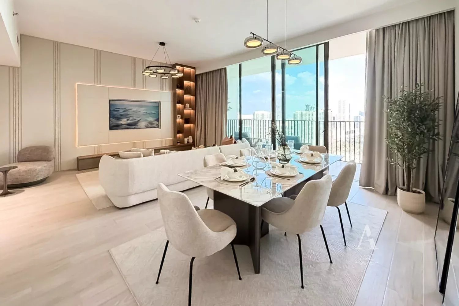 This apartment offers a practical and airy layout, with a spacious living and dining area, large windows for natural light, and a balcony overlooking lush gardens and the JVC skyline. The fully fitted kitchen comes equipped with premium appliances and sleek cabinetry. All bedrooms are well-proportioned, with built-in wardrobes and en-suite bathrooms, including elegant fixtures by GROHE and VITRA.