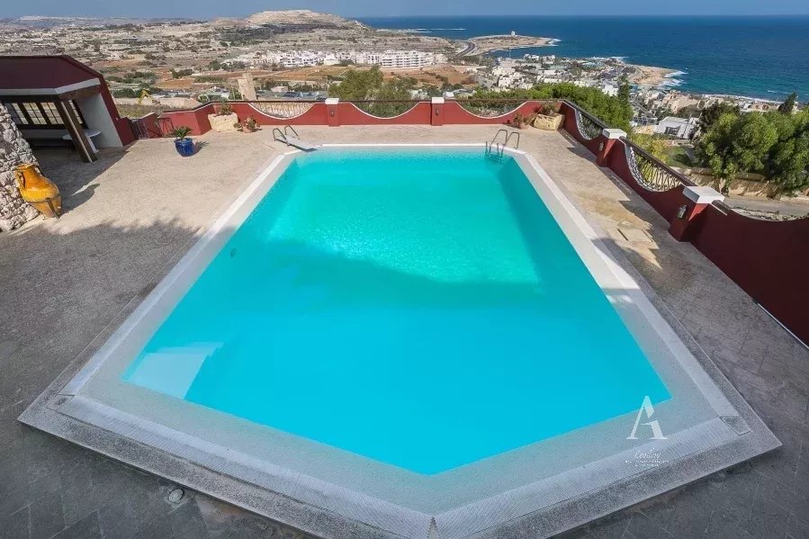 This exquisite 1800 m² villa located in Bahar Ic-Caq, Naxxar, Malta, offers a luxurious lifestyle with its panoramic views of the Mediterranean. The property showcases six spacious bedrooms, each equipped with modern amenities including air-conditioning and aluminum windows with double glazing for optimal comfort. Step outside to enjoy the expansive swimming pool and well-designed barbecue area, perfect for hosting gatherings with family and friends.
