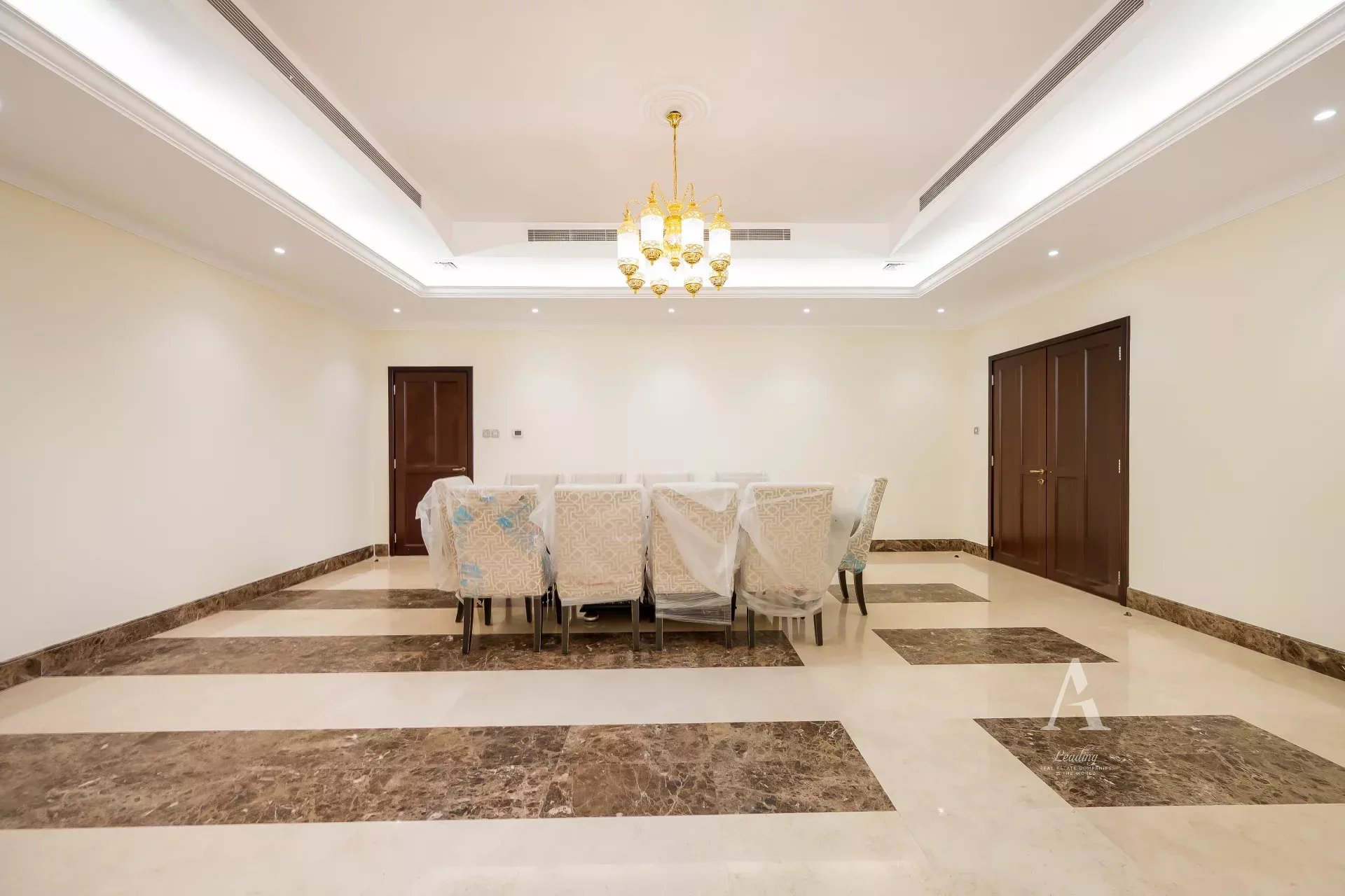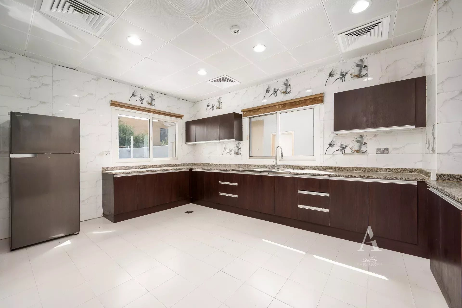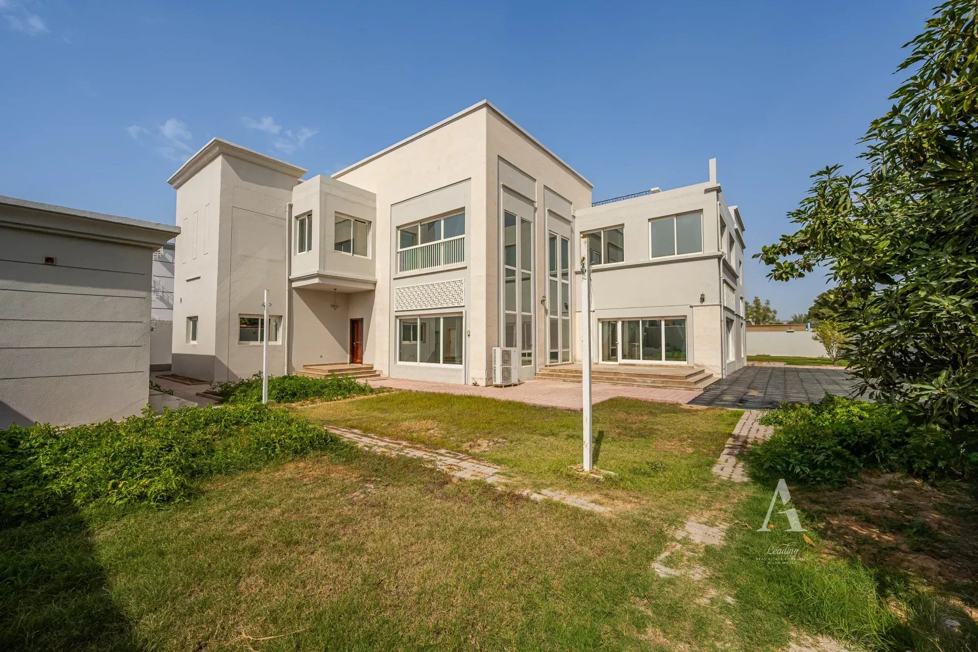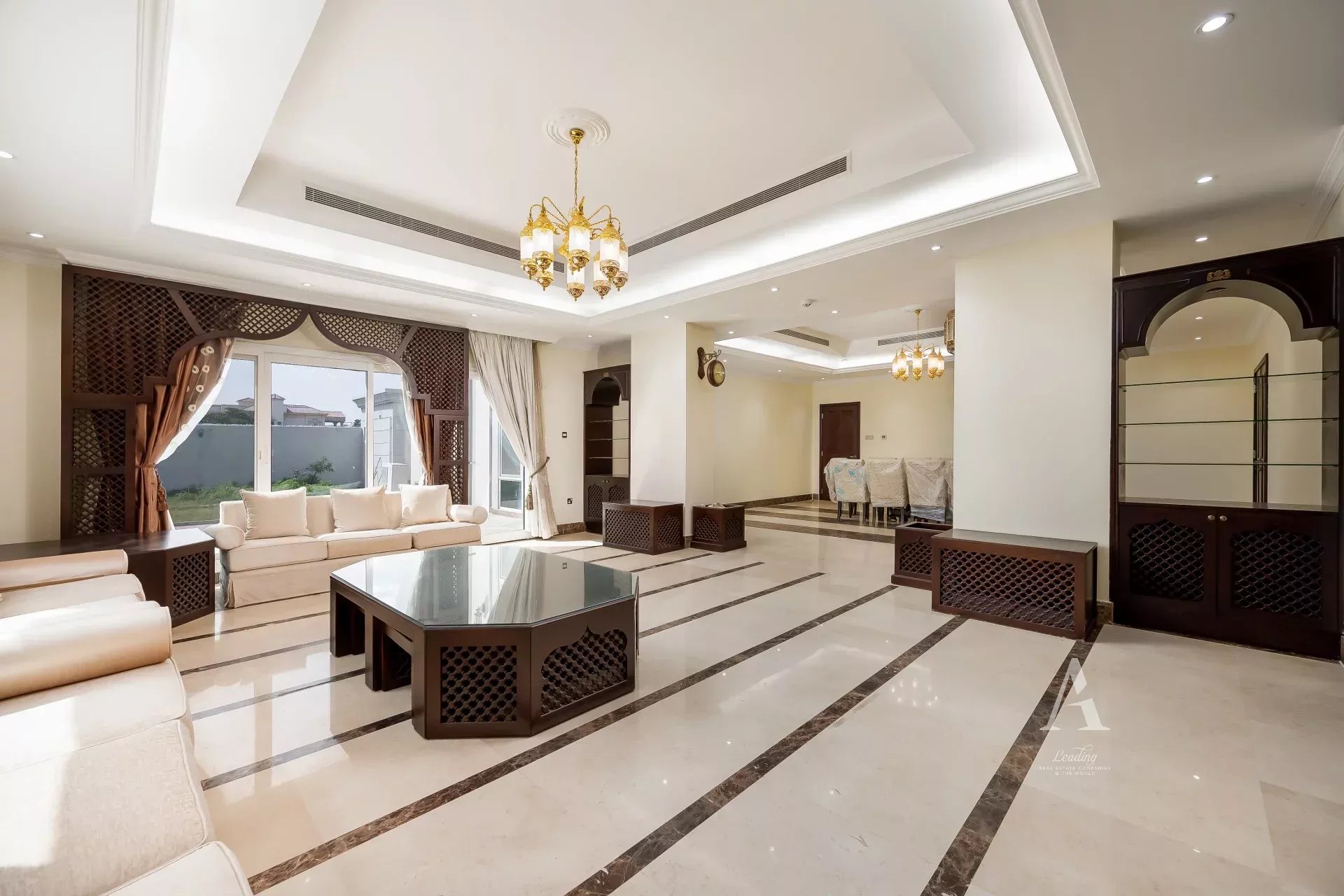 The villa is finished with premium marble flooring, adding to its timeless appeal, and includes a closed kitchen with ample storage and workspace. Outdoors, a private garden creates a serene environment for relaxation or entertaining. Ample parking is available with interior garage spaces and exterior shaded parking.