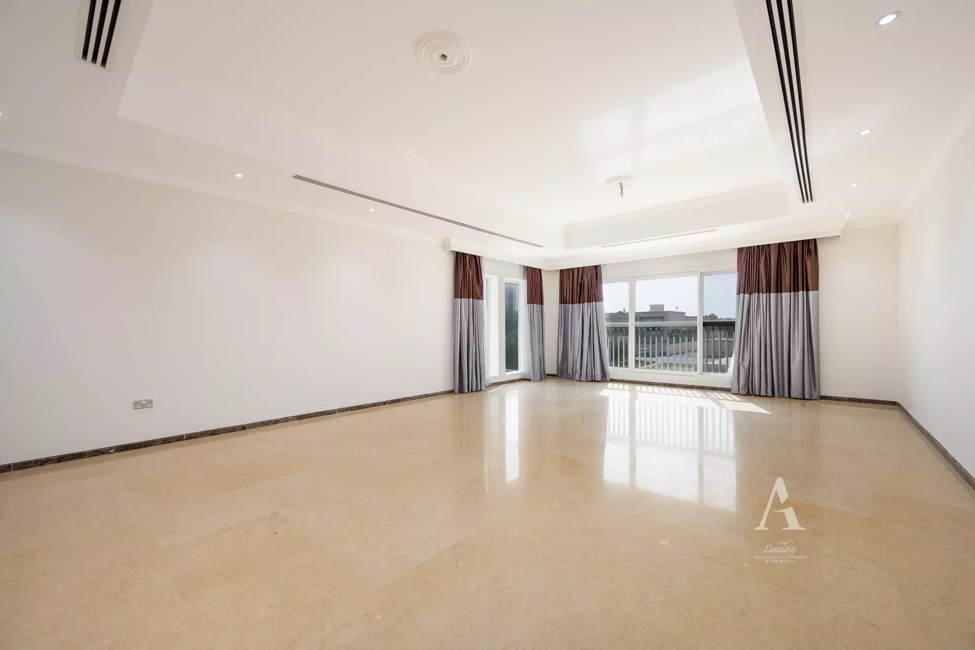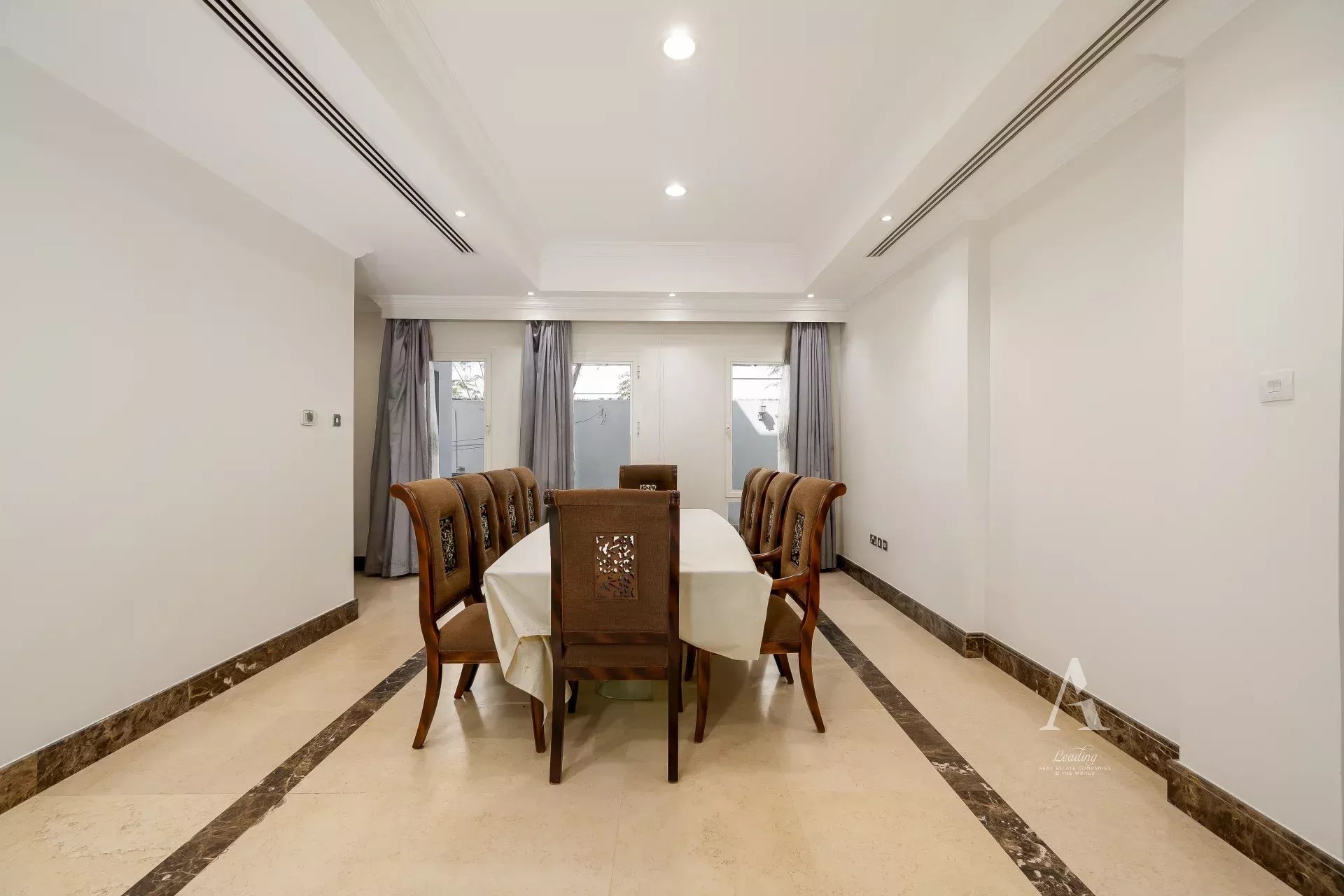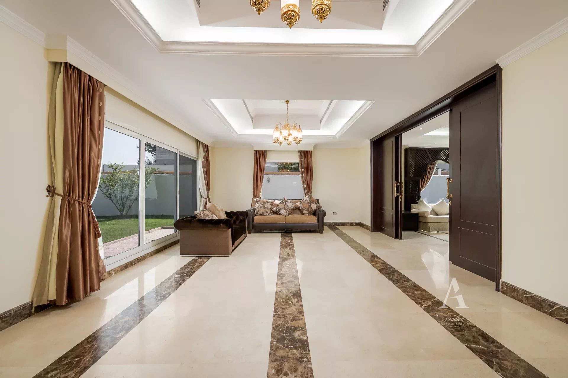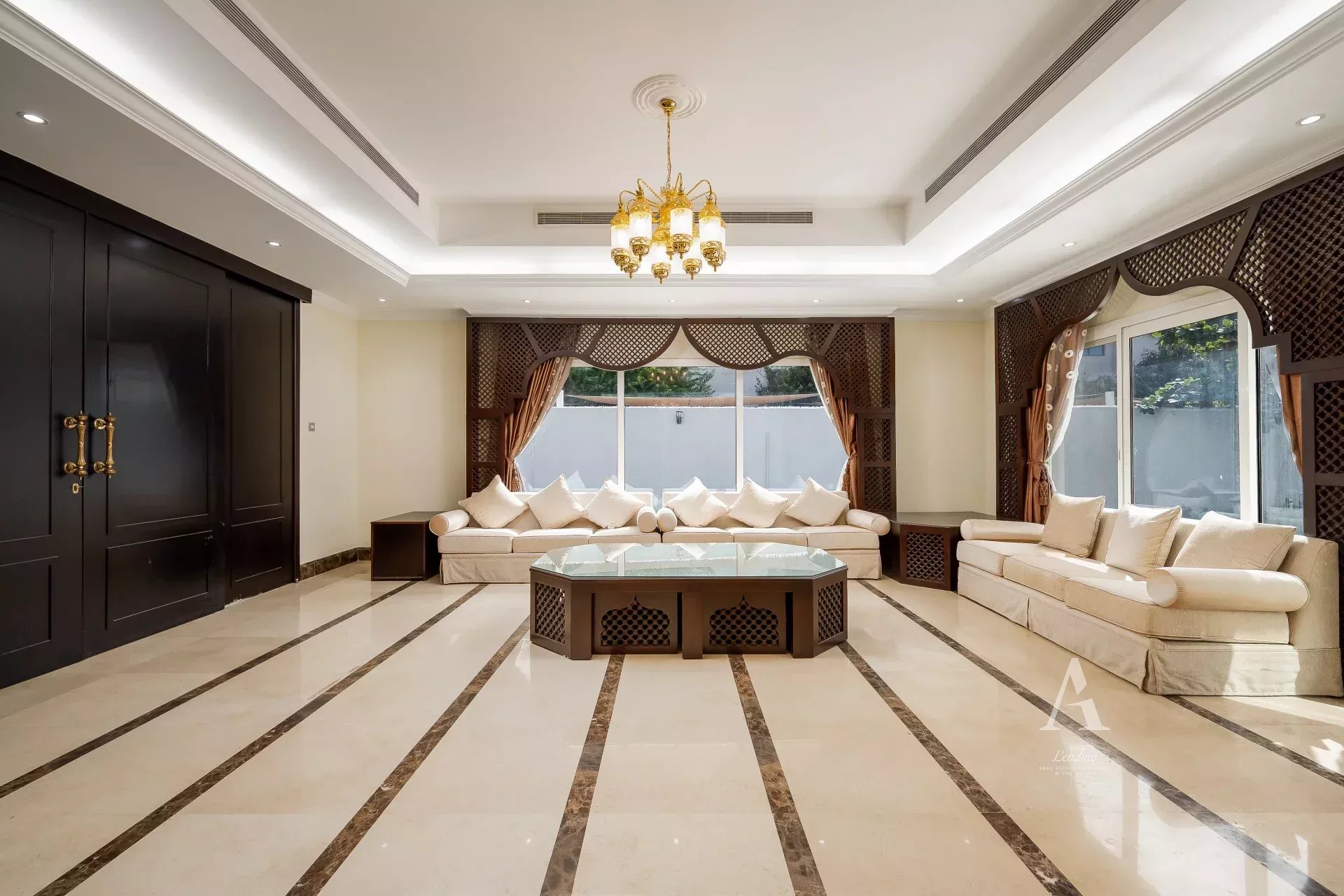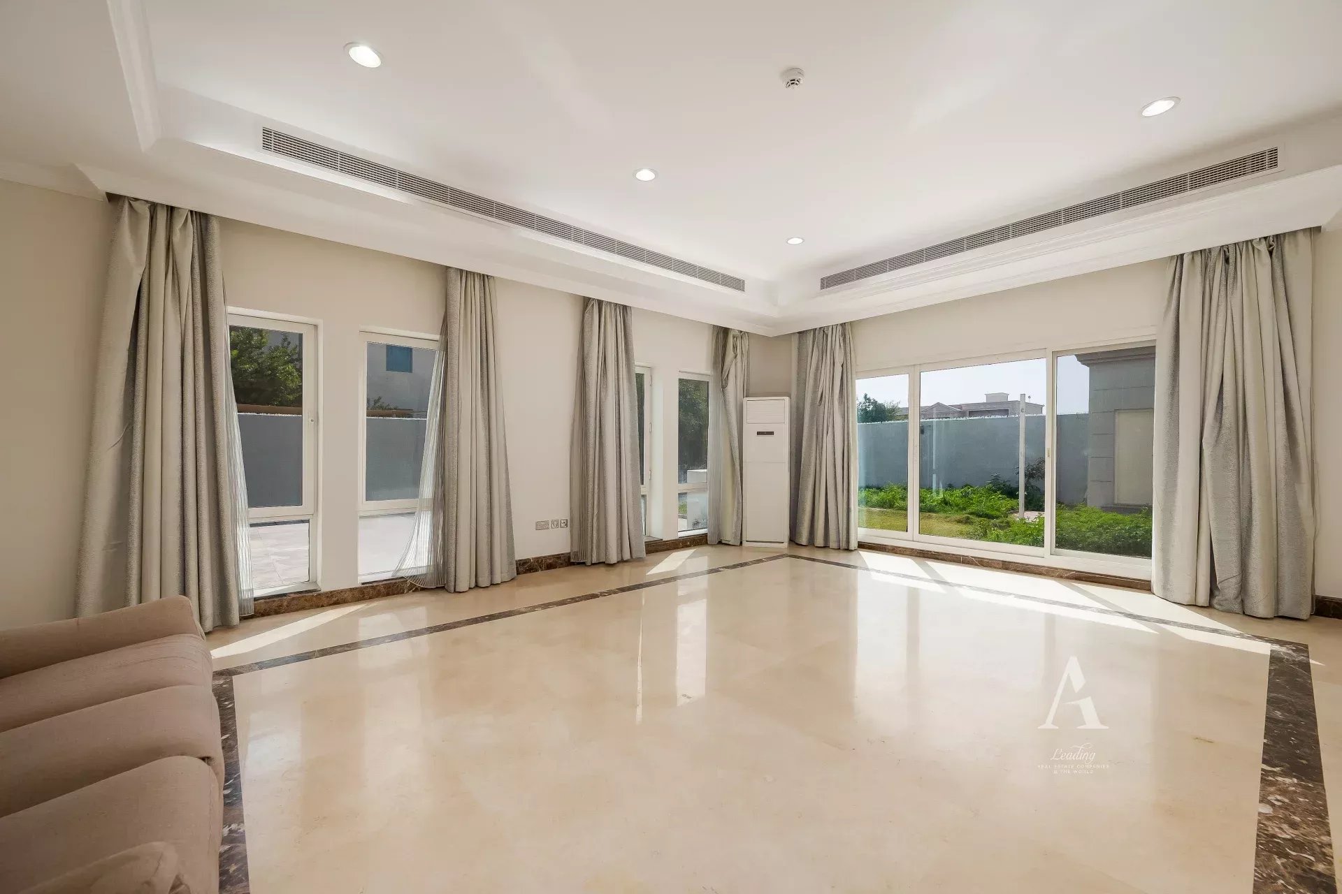 The villa is finished with premium marble flooring, adding to its timeless appeal, and includes a closed kitchen with ample storage and workspace. Outdoors, a private garden creates a serene environment for relaxation or entertaining. Ample parking is available with interior garage spaces and exterior shaded parking.