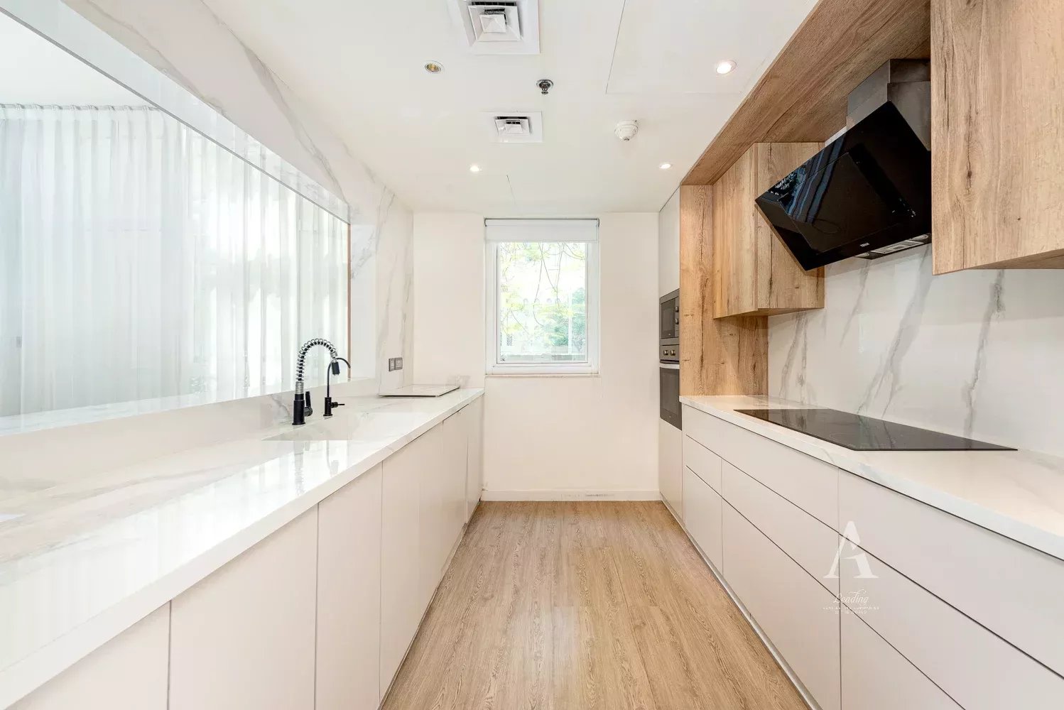 This fully renovated inside/out Duplex Villa features a spacious living room and an upgraded built-in semi-open kitchen with floor-to-ceiling windows. There are three large bedrooms, a maid's room with an ensuite bathroom, storage room, and a separate washroom for guests.